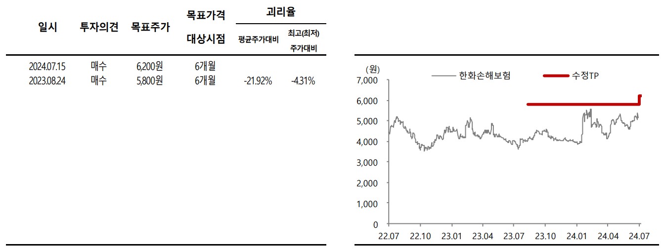 한화손해보험의 목표주가는 6,200원으로 설정됨. 이는 현재 주가 대비 상당한 상승 여력을 가짐.