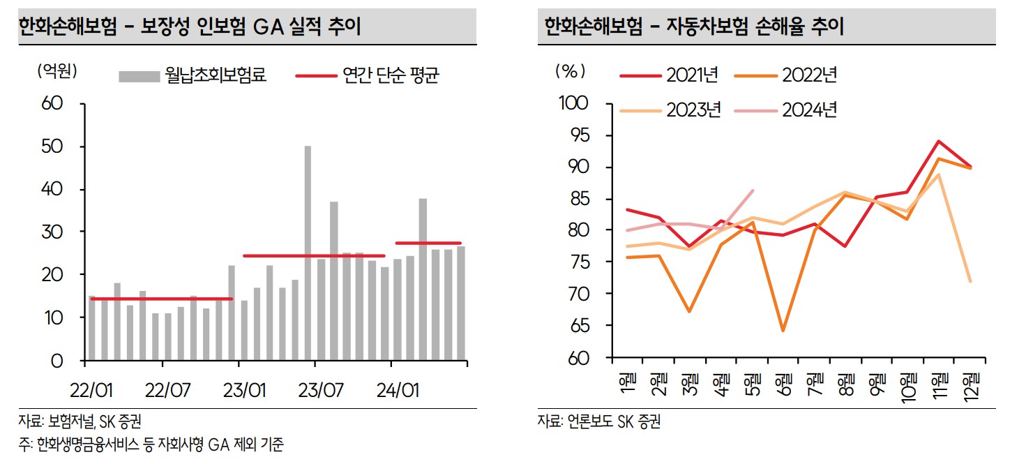 한화손해보험의 실적은 전반적으로 안정적임. 보험손익은 장기보험의 위험손해율 안정화와 일반손해보험의 안정적인 성과로 개선되고 있음. 다만, 자동차보험은 손해율 상승으로 인해 부진한 상황임. 투자손익은 금리 하락 등의 영향으로 일부 감소가 예상됨.