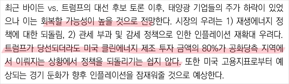 한화솔루션은 재생에너지 및 친환경 사업 부문에서의 성장이 두드러지며, 특히 태양광 및 수소 사업에서의 성과가 기대됨. 목표주가는 120,000원으로 제시되며, 현재 주가 대비 25% 상승 여력이 있음. 지속적인 기술 개발과 글로벌 시장에서의 확장을 통해 한화솔루션의 미래는 밝음.