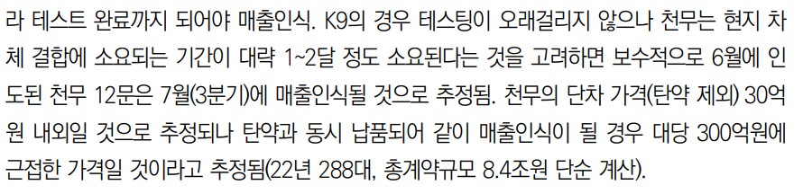 - 특히, K9 자주포와 천무 다연장로켓 등 주요 무기체계의 수출이 매출 증대에 기여하고 있음.
