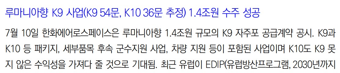- 2023년에는 루마니아와 폴란드 등지에서 대규모 수주에 성공하며 글로벌 방산 시장에서의 입지를 확고히 다지고 있음.