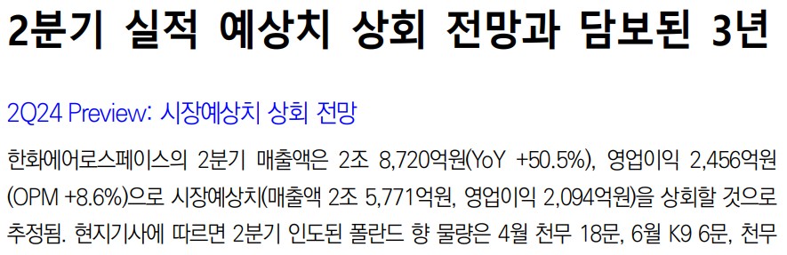 한화에어로스페이스는 항공우주와 방산 부문에서 꾸준한 성장을 보이고 있으며, 특히 방산 부문에서의 해외 수주 확대가 두드러짐. 중동과 유럽 등지에서의 추가적인 수주가 기대되며, 이는 주가 상승의 중요한 동력으로 작용할 것임. 본인의 생각으로는 방산 부문에서의 지속적인 성장이 주가에 긍정적인 영향을 미칠 것으로 보임.