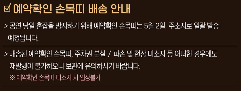 - 주의 사항: 입장 손목띠를 다른 사람에게 판매하는 행위는 금지되어 있으며, 위반 시 신고 접수 가능합니다.