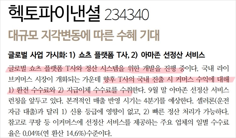 헥토파이낸셜은 다양한 신규 서비스 런칭과 글로벌 시장에서의 확장으로 긍정적인 주가 전망을 보이고 있음. 특히 T사와의 협업과 아마존 선정산 서비스 런칭이 주요한 성장 동력으로 작용함. 따라서, 중장기적으로 투자가치가 높다고 평가됨.