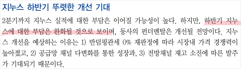 A. 하반기에는 지누스 실적 개선이 기대되며, 전체 실적 개선에 긍정적인 영향을 미칠 것으로 예상됩니다.