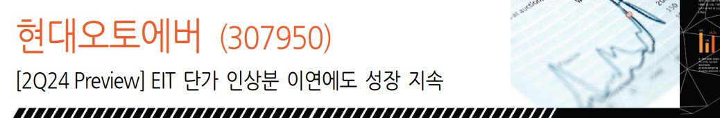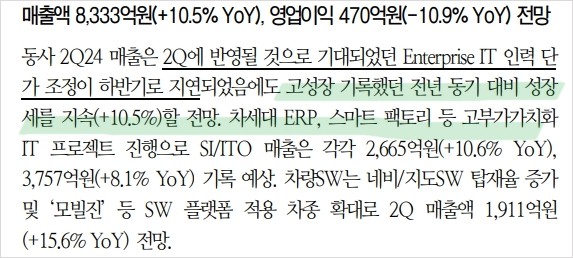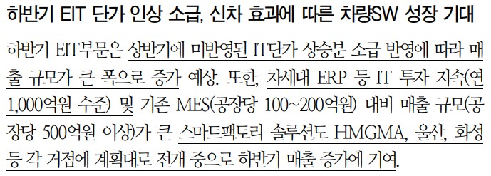 현대오토에버는 SI/ITO 매출이 각각 2,665억원(+10.6% YoY), 3,757억원(+8.1% YoY)으로 예상되며, 차량SW 매출은 1,911억원(+15.6% YoY)으로 전망됨. 하반기에는 EIT 단가 인상 소급 반영 및 신차 효과로 인한 차량SW 성장 기대됨. EIT부문은 상반기에 미반영된 IT 단가 상승분이 하반기에 반영될 예정이며, 스마트 팩토리 솔루션도 주요 거점에 계획대로 전개 중임.