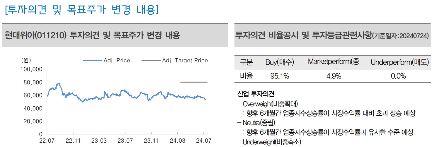 현대위아의 주가는 최근 실적 부진에도 불구하고, 본업의 턴어라운드와 신사업 모멘텀으로 인해 중장기적으로 긍정적인 방향으로 나아갈 가능성이 큼. 현대위아의 목표주가는 80,000원으로 유지되고 있으며, 현재 주가 대비 상승 여력이 큼.