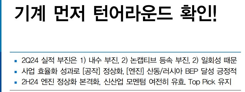 현대위아는 최근 엔진 사업의 수익성 개선과 함께 공작기계 부문의 턴어라운드를 확인하며 긍정적인 실적을 기록함. 또한, 멕시코 HEV 엔진 수주로 인한 추가적인 매출 성장 가능성이 높아지고 있음. 2024년 하반기부터는 중국 및 러시아 공장의 가동률 상승으로 본업의 안정적 수익성 확보가 예상됨. 이러한 요인들이 현대위아의 주가에 긍정적인 영향을 미칠 것으로 보임.