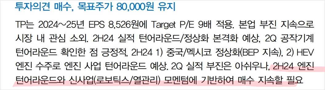 현대위아는 2024년 2분기 실적 부진을 겪었으며, 이는 내수 부진 및 논캡티브 제품의 판매 감소가 주요 원인이었음. 하지만 산동 및 러시아 공장에서의 BEP 달성으로 엔진 사업의 수익성이 개선되었으며, 2024년 하반기부터는 엔진 본업의 턴어라운드와 신사업 모멘텀이 본격화될 것으로 보임. 현대위아의 목표주가는 80,000원으로 유지되고 있으며, 현재 주가 대비 상승 여력이 큼.