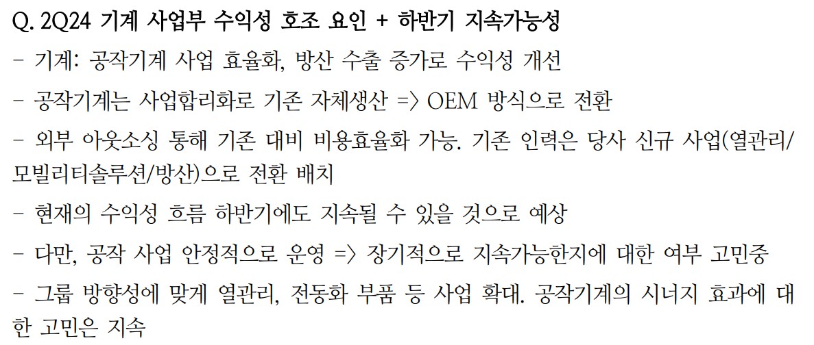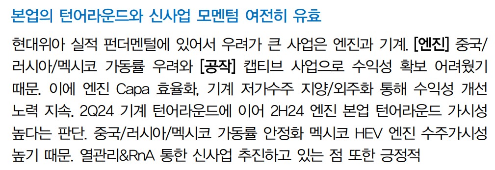 현대위아는 최근 엔진 사업의 수익성 개선과 함께 공작기계 부문의 턴어라운드를 확인하며 긍정적인 실적을 기록함. 또한, 멕시코 HEV 엔진 수주로 인한 추가적인 매출 성장 가능성이 높아지고 있음. 2024년 하반기부터는 중국 및 러시아 공장의 가동률 상승으로 본업의 안정적 수익성 확보가 예상됨. 이러한 요인들이 현대위아의 주가에 긍정적인 영향을 미칠 것으로 보임.