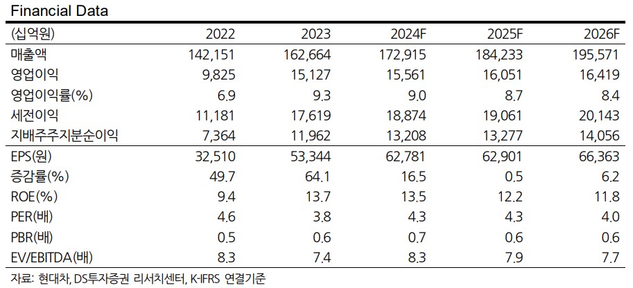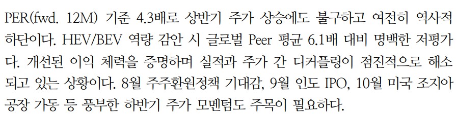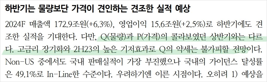 현대차는 2024년 하반기에도 견조한 실적을 기대할 수 있음. 고금리 장기화와 높은 기저효과로 인해 물량(Q)의 약세가 예상되지만, 가격(P)이 실적을 견인할 전망임. 우호적인 환율 환경, HEV 믹스 확대, 미국 조지아 공장 가동에 따른 인센티브 부담 완화 등이 긍정적으로 작용할 것임. 현대차는 여전히 저평가된 상태로, 주가 상승 여력이 큼.