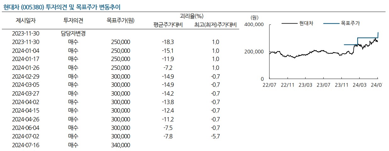 A. 현대차의 목표 주가는 340,000원으로 설정됨.