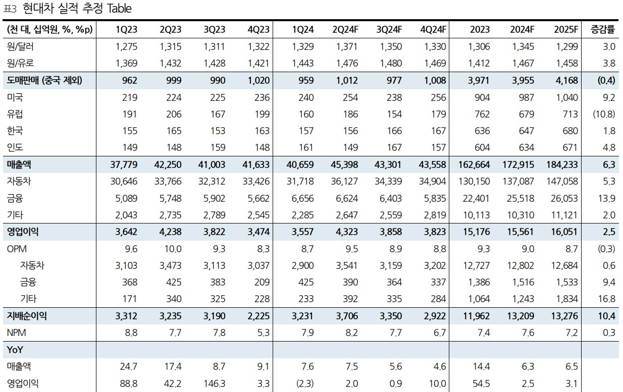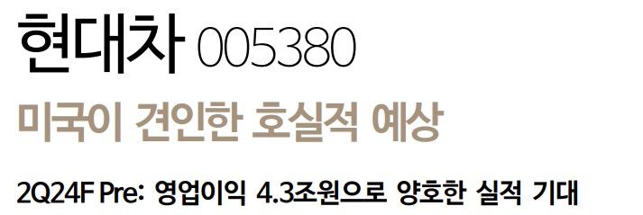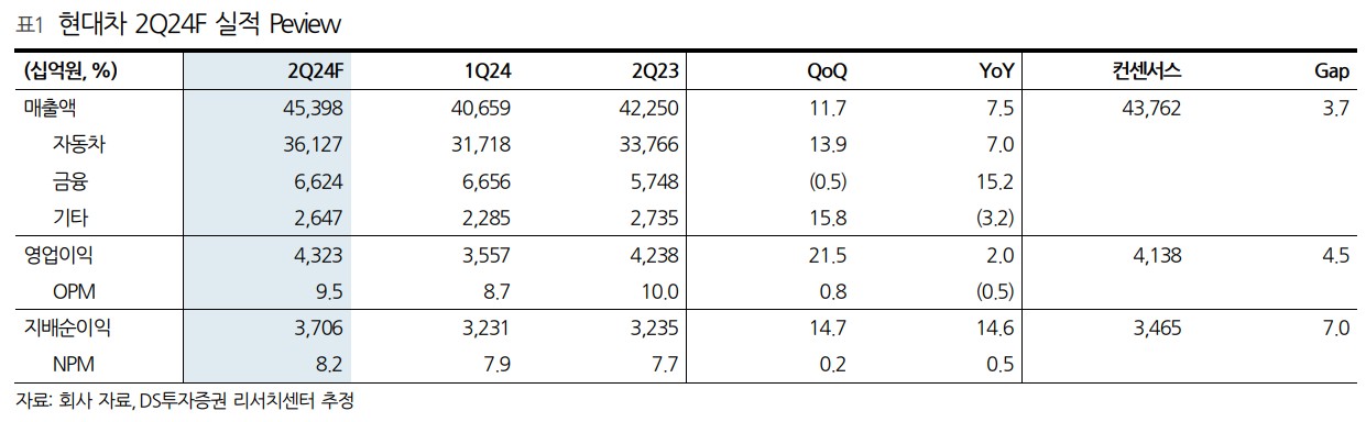 A. 현대차는 2024년 2분기 매출액 45.4조 원, 영업이익 4.3조 원을 기록할 것으로 예상됨.
