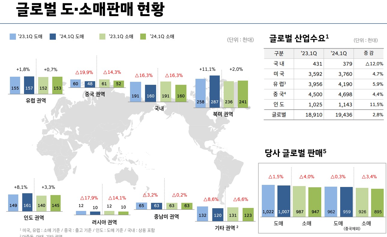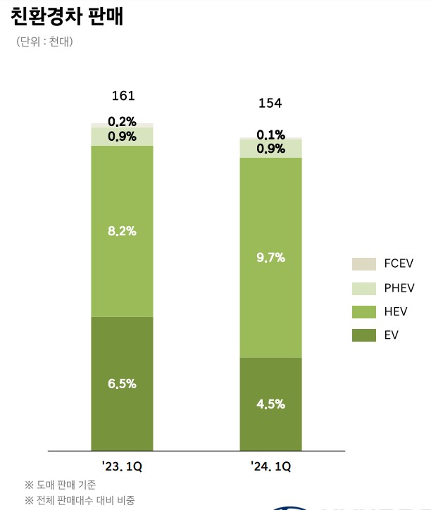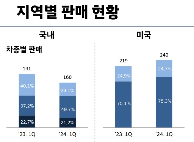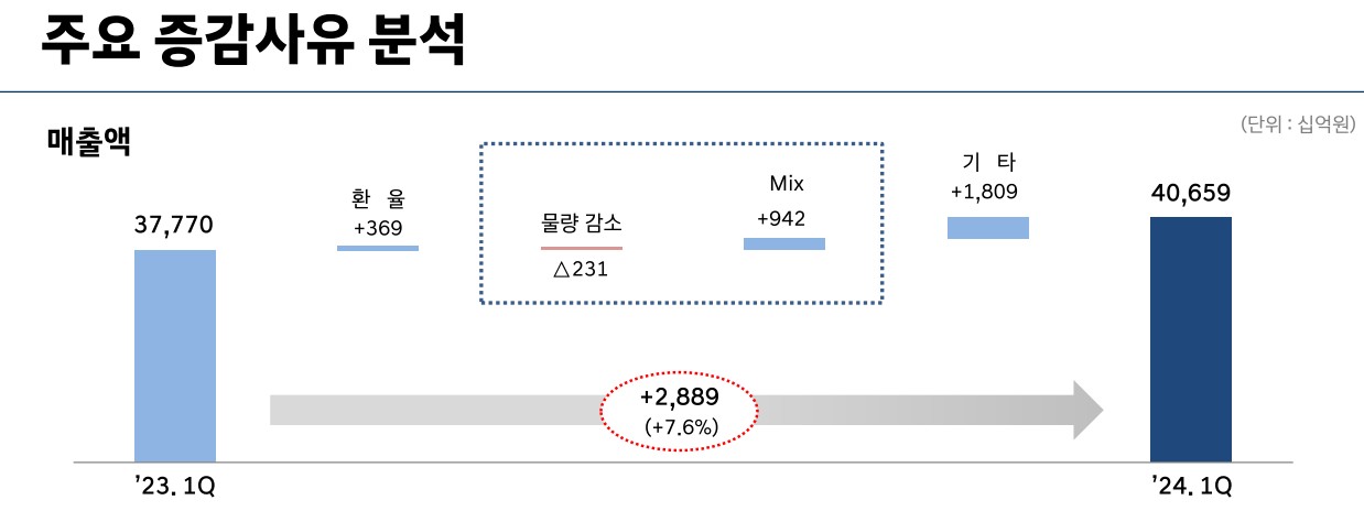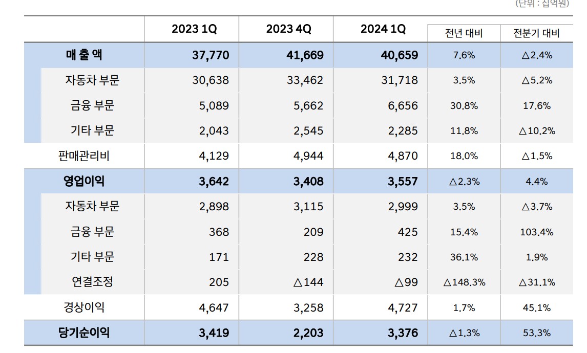 현대차는 글로벌 자동차 제조사로, 주요 사업 부문에서의 성장을 통해 매출과 영업이익 증가를 이루고 있음. 2024년 1분기 실적에서 매출액 16조 8,238억 원, 영업이익 1조 4,558억 원을 기록하였으며, 이는 전년 대비 매출액은 3.4%, 영업이익은 3.8% 감소한 수치임.