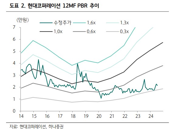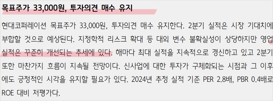 현대코퍼레이션의 목표주가는 33,000원으로 설정됨. 이는 현재 주가 대비 약 54%의 상승 여력을 의미함. 개인적으로는 현대코퍼레이션의 다양한 사업부문에서의 성과와 신사업 확장을 고려했을 때, 35,000원을 목표주가로 설정함.