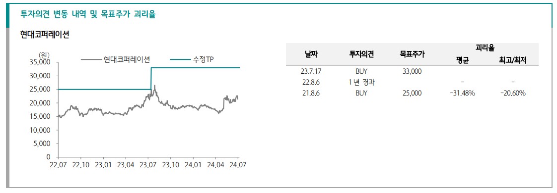 A. 현대코퍼레이션의 목표주가는 33,000원으로 설정되어 있으며, 이는 현재 주가 대비 약 54%의 상승 여력을 의미합니다.