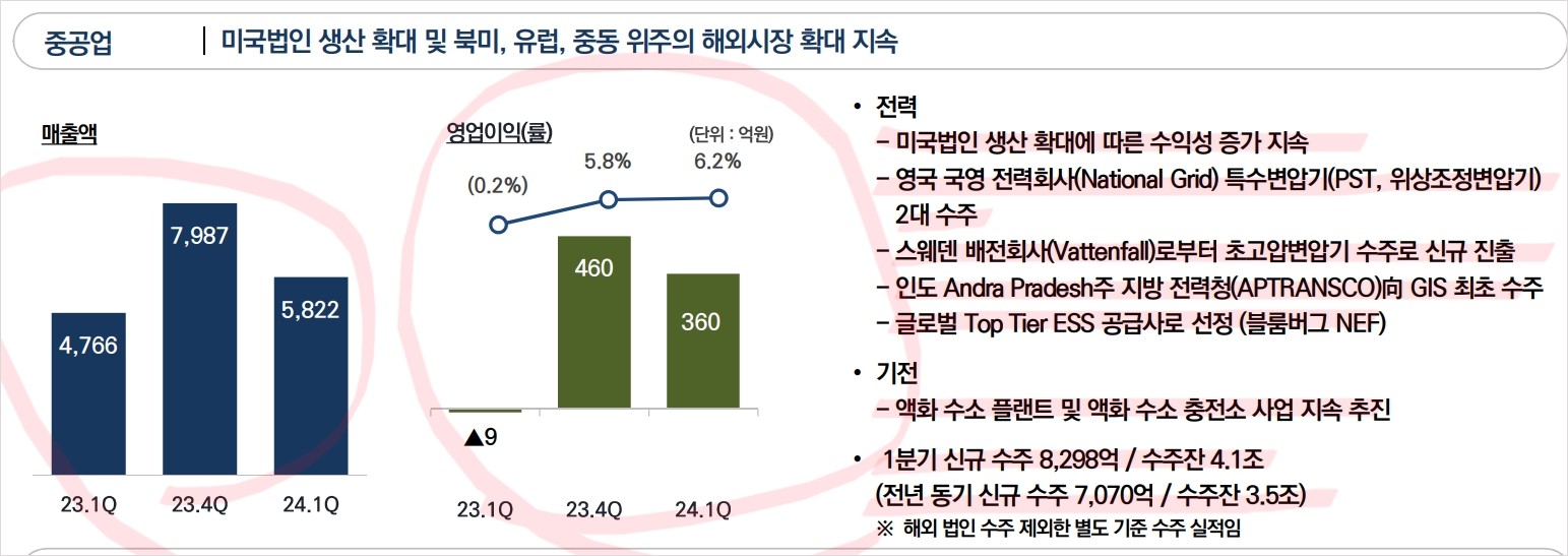효성중공업의 최근 이슈는 주로 수주 상황과 증설 계획에 집중되어 있음. 2024년 1분기 기준으로 신규 수주액은 8,298억 원이며, 수주잔고는 4.1조 원에 달함. 이는 전년 동기 대비 크게 증가한 수치임. 특히, 전력기기 수요 증가에 대응하기 위한 증설 계획이 주목받고 있음.