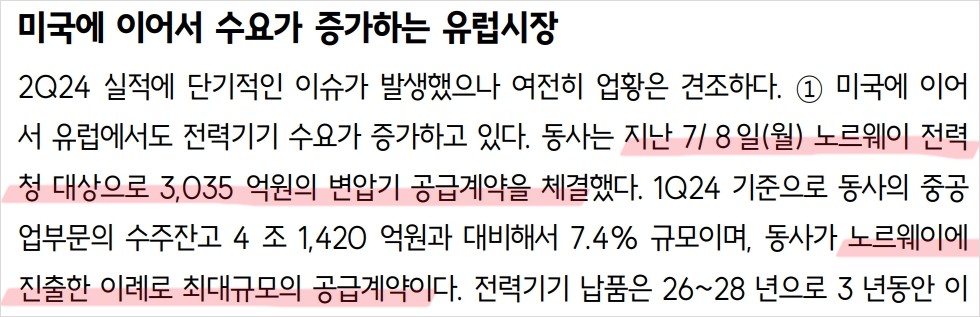 효성중공업은 최근 노르웨이 전력청과 3,035억원 규모의 변압기 공급계약을 체결함. 이는 회사의 중공업 부문 수주잔고의 7.4% 규모로, 회사가 노르웨이에 진출한 이후 최대 규모의 계약임. 또한, 변압기 생산공장 증설 계획을 발표하며, 총 1,000억원을 투자할 예정임.