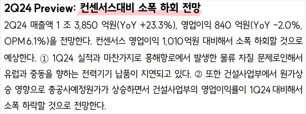 효성중공업은 2024년 2분기 매출액 1조 3,850억원(YoY +23.3%), 영업이익 840억원(YoY -2.0%, OPM 6.1%)을 기록할 것으로 예상됨. 이는 컨센서스 영업이익 1,010억원 대비 소폭 하회할 전망임. 홍해항로의 물류 차질 문제와 건설사업부의 원가상승이 주요 요인임.