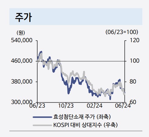 효성첨단소재는 탄소섬유와 타이어보강재 분야에서 강력한 경쟁력을 가진 글로벌 기업으로, 2024년 하반기부터 매출과 수익성 개선이 예상되는 기업임. 최근 2024년 1분기 실적을 발표하며 투자자들의 주목을 받고 있음. 2024년 1분기 매출액은 836.8억 원, 영업이익은 63.7억 원으로 집계됨. 현재 주가는 338,000원이며, 목표 주가는 520,000원으로 설정됨.