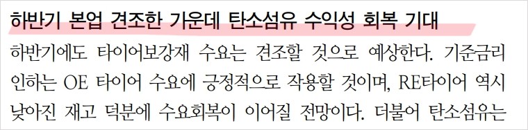• 타이어보강재는 글로벌 해상운임 상승과 운항거리 증가로 인해 재고 확보 움직임이 지속되고 있음.