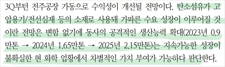 효성첨단소재는 타이어보강재 및 산업용 섬유를 주력으로 하는 기업으로, 글로벌 시장에서의 입지를 강화하고 있음. 최근 타이어보강재 수요 회복과 함께 영업이익이 증가하고 있으며, 탄소섬유의 중국 신규 공장 가동으로 인해 ASP 하락이 나타났지만 3분기부터는 전주공장 증설로 수익성 회복이 기대됨. 효성첨단소재는 높은 성장 잠재력을 가진 기업으로, 장기적인 투자 매력이 큼. 주가 목표는 440,000원으로 설정되었으며, 이는 현재 주가 대비 약 22.7% 상승 여력이 있음.