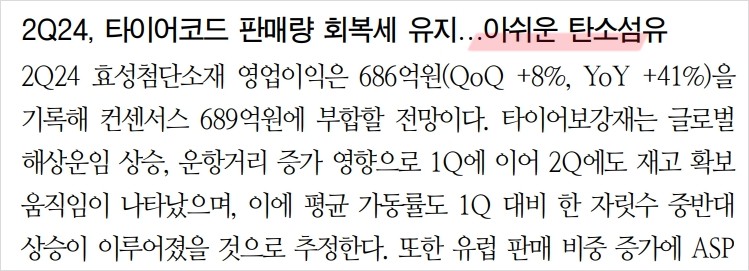 효성첨단소재는 최근 타이어보강재 수요 회복과 함께 영업이익이 증가하고 있음. 2024년 2분기 영업이익은 686억원으로 예상되며, 이는 컨센서스에 부합하는 수치임. 타이어보강재는 글로벌 해상운임 상승과 운항거리 증가로 인해 재고 확보 움직임이 지속되고 있음. 반면, 탄소섬유는 중국 신규 공장 가동으로 인해 ASP 하락이 나타나 1Q 수준의 영업이익을 기록할 전망임. 아라미드는 판가 하락이 이어지며 1Q 대비 감익이 예상됨.