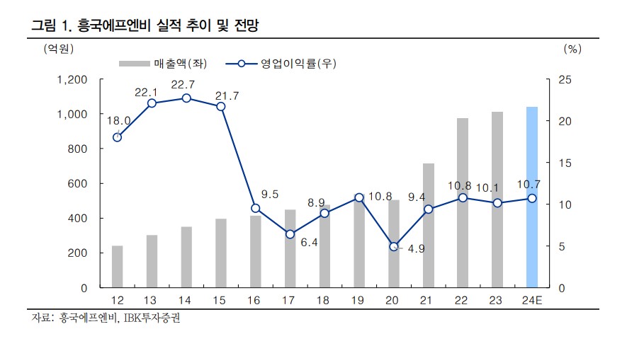 흥국에프엔비는 2023년 매출액 101억 원, 영업이익 10억 원을 기록함. 2024년 예상 매출액은 1,039억 원, 영업이익은 111억 원으로 전망됨. 부채비율은 114.7%로 다소 높은 수준이나, 자산 대비 부채 비율이 양호하여 재무구조는 안정적임. 아래 표는 2021년부터 2024년까지의 주요 재무지표임.