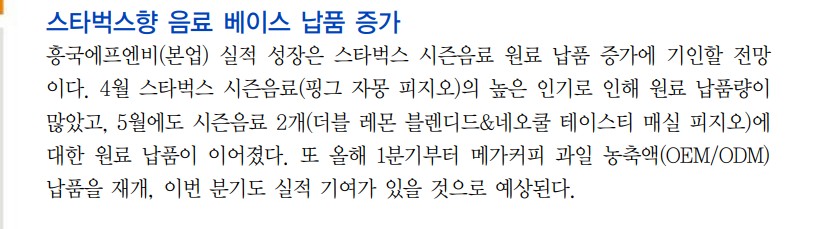 흥국에프엔비는 최근 스타벅스와 메가커피에 음료 베이스를 납품하면서 매출이 증가하고 있음. 특히 스타벅스 시즌음료(핑그 자몽 피지오, 더블 레몬 블렌디드, 네오쿨 테이스티 매실 피지오) 원료 납품이 크게 늘어남. 자회사 테일러팜스는 동남아 수출 호조세로 매출 증가가 예상됨. 스타벅스 음료 베이스 납품 증가로 실적 개선 기대.