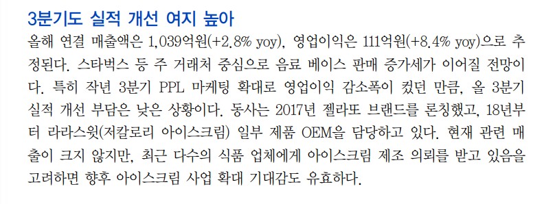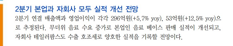 흥국에프엔비 주가 전망 좋음!! 2024년 예상 매출액은 1,039억 원, 영업이익은 111억 원으로 전망됨. 특히 무더위로 인한 음료 수요 증가와 스타벅스 시즌음료 원료 납품 증가가 실적에 긍정적인 영향을 미칠 것으로 예상됨. 폭염 관련주로 엮여서 아주 기냥 응?