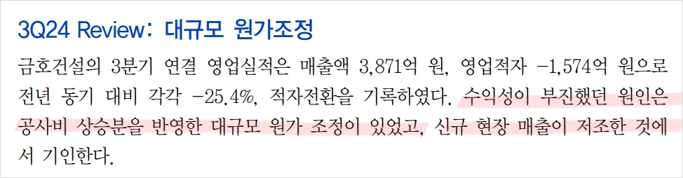 금호건설은 2024년 3분기에 대규모 원가 조정으로 인한 부진한 실적을 기록하며, 매출액은 전년 대비 25.4% 감소한 3,871억 원, 영업적자는 -1,574억 원을 나타냈습니다. 이는 주요 사업장인 LH 및 SOC 현장에서의 손실과 물가 상승에 대한 비용 반영 부족 등이 주요 원인으로 지목됩니다. 하지만, 회사는 신규 수주와 분양 프로젝트를 통해 점진적인 수익성 개선을 기대하고 있습니다. 현재 주가는 3,025원으로, 목표주가 3,100원 대비 상승 여력이 2.4%로 나타나고 있습니다.