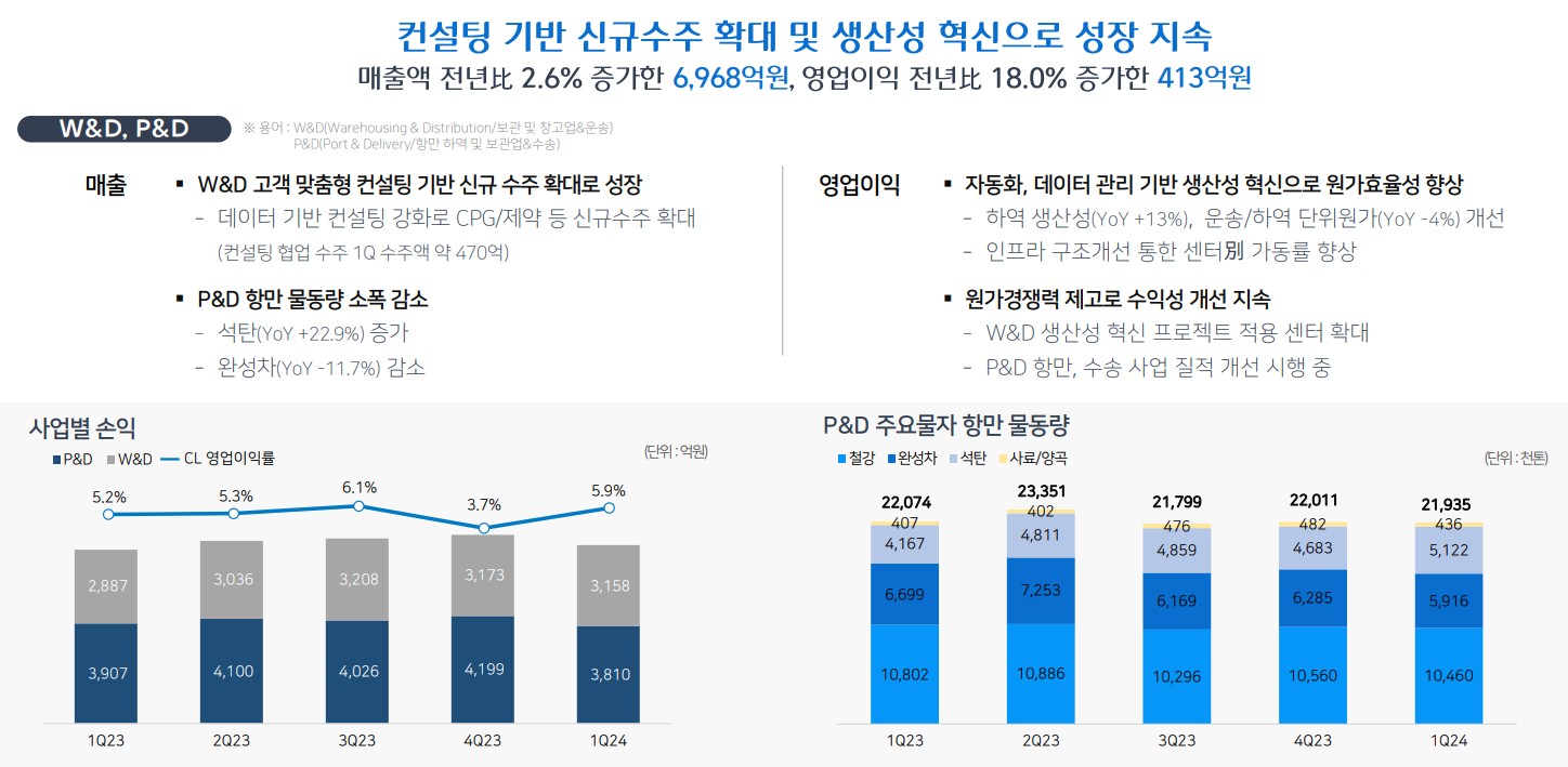 CJ대한통운은 다양한 호재 요인을 바탕으로 하반기 실적 개선이 기대됨. 2024년 1분기 매출액은 2조 9,214억 원, 영업이익은 1,094억 원을 기록하며 전년 동기 대비 각각 4.0%, 10.4% 증가함. 특히 택배 및 이커머스 부문의 성장세가 두드러지며, 글로벌 사업 확장도 지속되고 있음. 또한, 자동화 기반의 운영 효율화로 원가 절감과 수익성 개선이 이루어지고 있음. 글로벌 포워딩 회복 및 동남아 시장 확장도 긍정적인 요소로 작용할 것임. 이는 전사 신규수주 확대 및 물량 증가에 따른 것임.