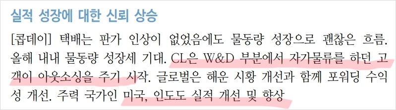 A. CJ대한통운의 최근 실적은 물동량 증가와 글로벌 부문 실적 개선으로 인해 긍정적임. 영업이익도 상승세를 보였음.