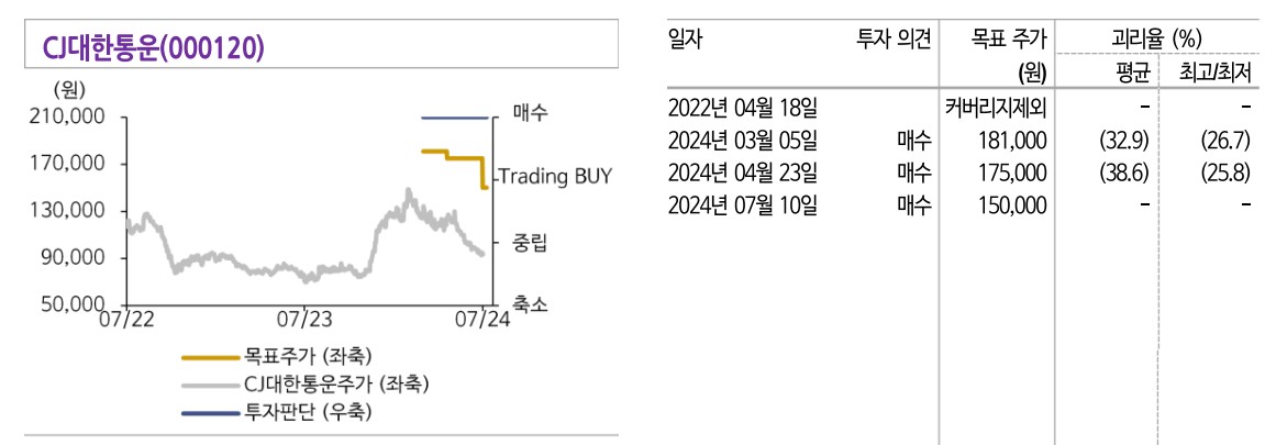 CJ대한통운의 최근 실적과 전망을 종합해보면, 하반기 성수기와 연휴 시즌에 실적 개선이 기대됨. 글로벌 물류 시장 회복 여부가 중요한 변수로 작용할 것임. 장기적으로는 주가 상승 가능성이 높음. 따라서 투자의견은 매수로 유지되며, 목표주가는 150,000원으로 제시됨.