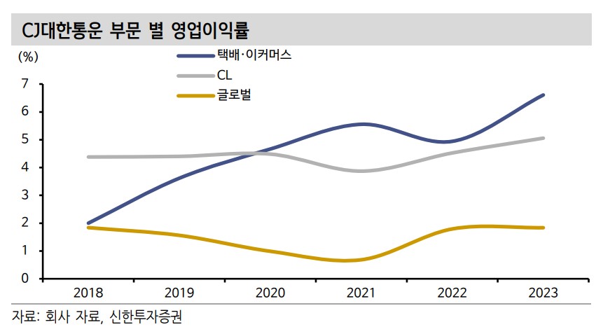 CJ대한통운의 최근 이슈는 다음과 같음. 알리 익스프레스와의 계약은 매우 유리한 조건으로 체결되었으며, 테무와의 물동량 증가도 긍정적인 영향을 미치고 있음. 또한, 자동화 로봇 도입으로 택배 부문 영업이익률이 지속적으로 상승하고 있음. 글로벌 부문에서는 동남아시아 지역에서의 실적 불확실성에도 불구하고, 미국과 인도 시장에서의 실적 개선이 주목할 만함. 특히, 미국 시장에서의 효율화 작업으로 마진이 개선되고 있음. 이러한 긍정적인 요소들이 CJ대한통운의 주가에 긍정적인 영향을 미칠 것으로 보임.