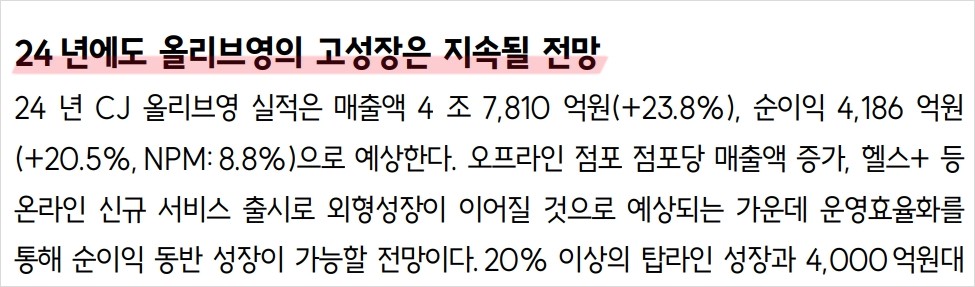 CJ의 최근 이슈로는 CJ 올리브영의 고성장세가 있음. 2024년 CJ 올리브영 실적은 매출액 4조 7,810억원, 순이익 4,186억원으로 예상됨. 오프라인 점포 매출 증가와 온라인 신규 서비스 출시가 주효했음. CJ 올리브영의 성장은 CJ의 전체 가치 상승에 기여할 전망. 또한, CJ는 CJ제일제당과 CJ ENM의 실적 개선을 통해 주가 상승을 기대하고 있음. 최근 CJ의 목표주가는 14만원으로 상향 조정됨. 이와 같은 성과는 CJ의 주가에 긍정적인 영향을 미칠 것임.