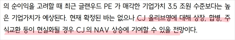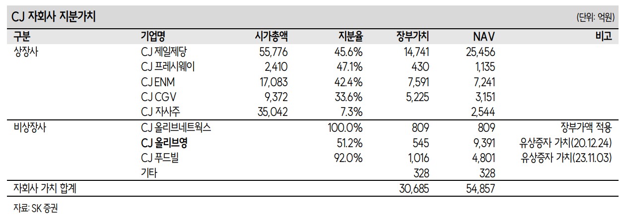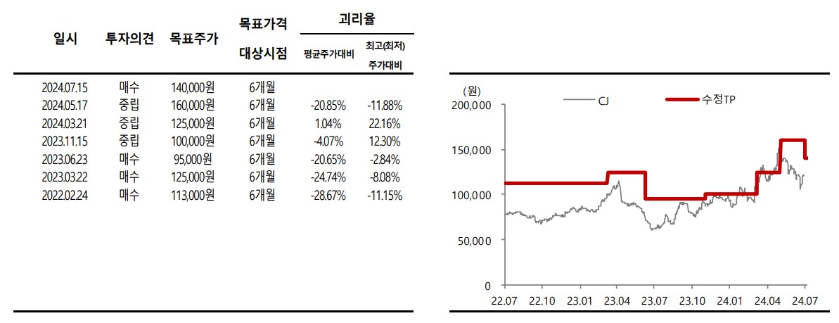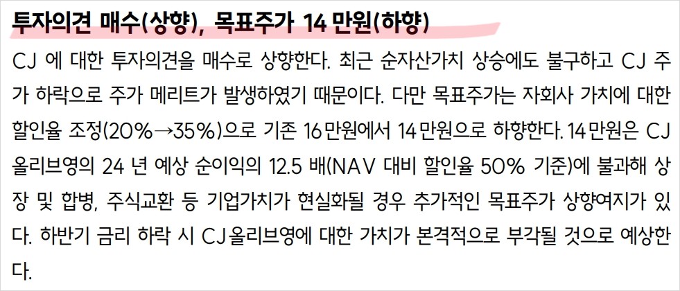 CJ의 목표주가는 14만원으로 설정됨. 이는 CJ 올리브영의 24년 예상 순이익의 12.5배(NAV 대비 할인율 50% 기준)에 해당하는 수치임. 현재 주가 대비 16.6%의 상승 여력을 보임. 상장 및 합병, 주식교환 등 기업가치가 현실화될 경우 추가적인 목표주가 상향 여지가 있음.