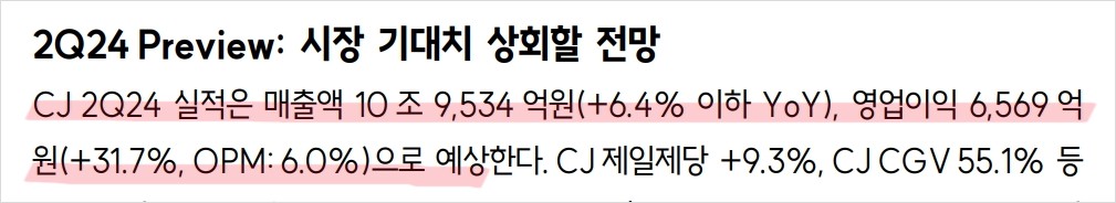 A. CJ는 최근 매출액 10조 9,534억원, 영업이익 6,569억원을 기록하며 시장 기대치를 상회하는 실적을 발표했음.