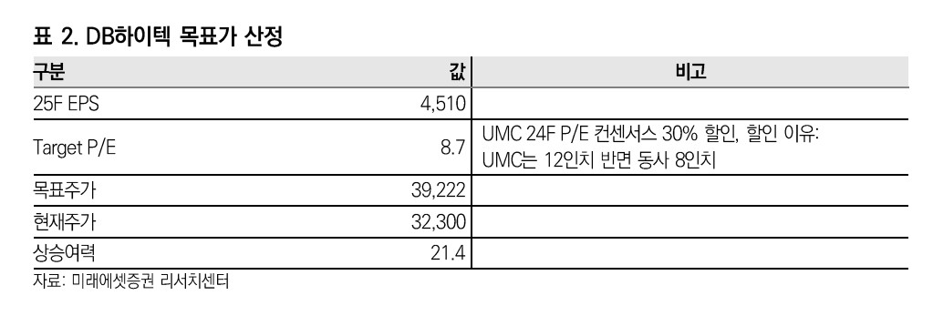 미래에셋증권 리서치센터는 DB하이텍의 목표주가를 39,200원으로 제시하고 있음. 이는 25F 추정 EPS 4,510원에 Target P/E 8.7배를 적용한 결과임. Target P/E는 동사의 글로벌 피어그룹 가운데 밸류에이션이 가장 낮은 UMC의 25F P/E 컨센서스를 20% 할인한 수준임. 이러한 목표주가는 현재 주가 대비 약 21.4%의 상승 여력을 나타내고 있음. 목표주가 산정의 근거로는 DB하이텍의 기술력, 신규 수주 가능성, 그리고 반도체 업황 회복에 따른 실적 개선 기대감 등이 고려됨. 다만, 글로벌 경기 불확실성과 반도체 업황의 변동성을 감안할 때, 목표주가 달성 시기는 유동적일 수 있음.