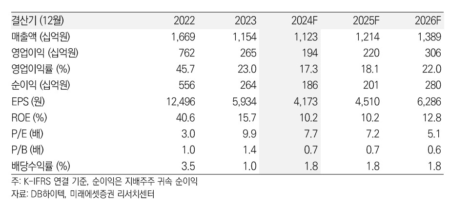 DB하이텍의 재무 상황은 업황 부진에도 불구하고 비교적 안정적인 모습을 보이고 있음. 2023년 기준 부채비율은 17.4%로 매우 양호한 수준을 유지하고 있음. 최근 4분기 실적을 살펴보면, 매출액과 영업이익이 전년 동기 대비 감소세를 보이고 있으나, 여전히 흑자를 유지하고 있음. 2024년 3분기 기준 매출액은 2,878억원, 영업이익은 470억원, 당기순이익은 186억원을 기록함. 경쟁사 대비 매출액과 영업이익 감소폭이 다소 크지만, 이는 DB하이텍의 주력 제품군인 컨슈머, 산업용 반도체 시장의 부진이 주요 원인으로 분석됨. 그러나 테슬라向 전장용 반도체 위탁생산 추진 등 신규 사업 확대로 향후 실적 개선이 기대됨.