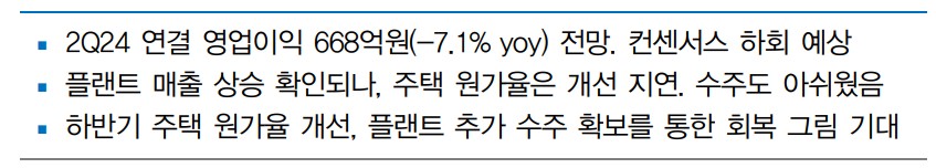 - 하반기 주택 원가율 개선 및 플랜트 추가 수주 기대