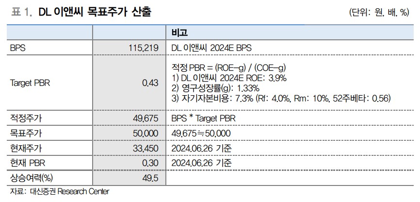 DL이앤씨의 목표 주가는 50,000원입니다. 이는 현재 주가 대비 약 49.5% 상승 여력이 있으며, 하반기 주택 원가율 개선과 플랜트 추가 수주를 통한 매출 확대를 반영한 수치입니다.