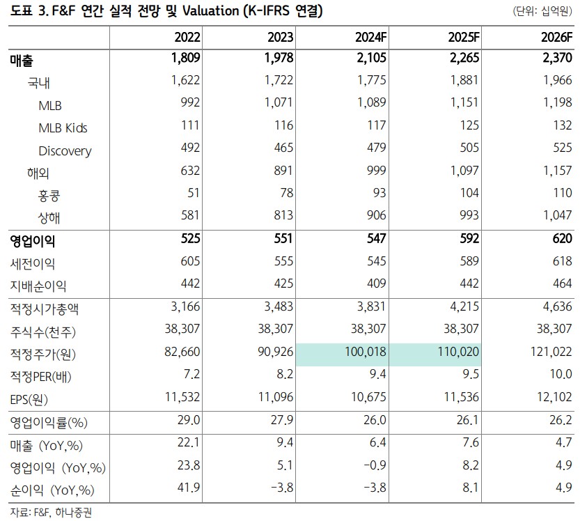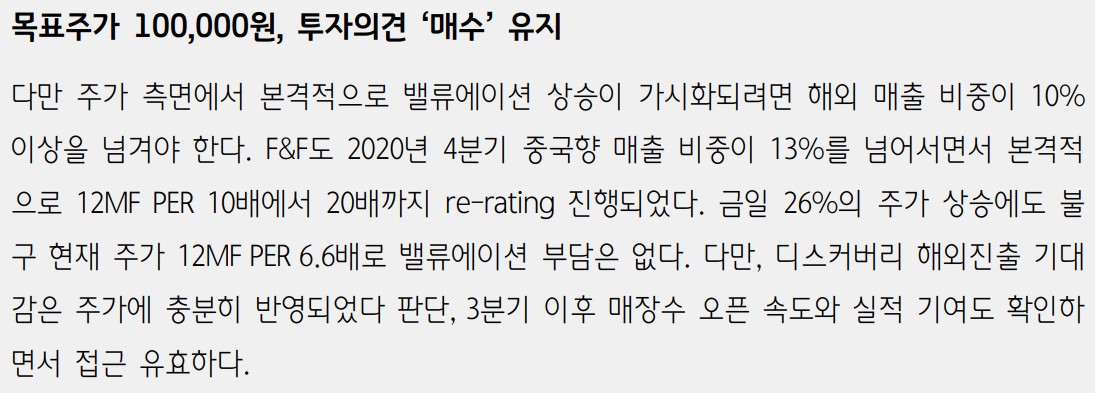 F&F의 목표주가는 현재 100,000원으로 설정되었음. 이는 디스커버리 브랜드의 아시아 진출과 MLB 브랜드의 성공적인 중국 시장 확대를 감안한 것임. 향후 해외 매출 비중이 증가할 경우, 목표주가는 더욱 상승할 가능성이 있음.