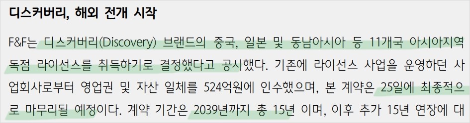 최근 F&F는 디스커버리 글로벌 판권을 모두 매수하고 해외 매출을 늘리려고 시도중임. 디스커버리 브랜드가 솔직히 이쁘긴 함. 가격이 드럽게 비싸서 그렇지. 이게 잘 팔리기만 하면 좋은데 최근 국제경기도 그닥 좋은 편이 아니라서 확신할 수는 없음. 글 참고바람. 이 글은 투자 권유 글이 아님.