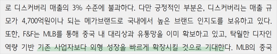 F&F는 MLB 브랜드와 디스커버리 브랜드를 통해 국내외 시장에서 강력한 입지를 구축하고 있음. 특히, 디스커버리 브랜드의 아시아 독점 라이선스 취득은 향후 성장 가능성을 크게 높여줄 것으로 기대됨. 중국 상해에 첫 매장을 오픈하며 본격적인 해외 진출을 시작할 계획이며, 이는 주가 상승의 주요 요인이 될 것으로 보임. 또한, MLB 브랜드의 성공적인 중국 진출 경험을 바탕으로 디스커버리 브랜드도 유사한 성과를 거둘 것으로 기대됨.