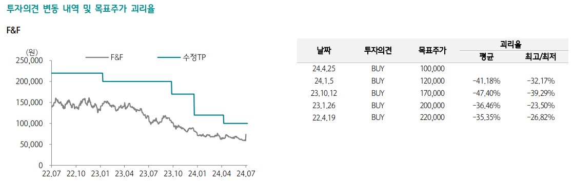 F&F의 목표주가는 현재 100,000원으로 설정되었음. 이는 디스커버리 브랜드의 아시아 진출과 MLB 브랜드의 성공적인 중국 시장 확대를 감안한 것임. 향후 해외 매출 비중이 증가할 경우, 목표주가는 더욱 상승할 가능성이 있음.