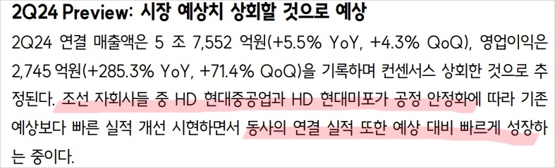 HD한국조선해양은 2024년 2분기에 시장 예상치를 상회하는 실적을 기록할 것으로 보임. 조선 자회사들의 공정 안정화가 주요 요인으로 작용함. 또한, 올해 조선/해양 부문 수주목표 135억 달러 중 129.5억 달러를 수주하며 목표의 95.9%를 달성함. 이로 인해 약 3.5년치의 수주잔고를 확보함. 하반기에는 수익성 위주의 선별수주 전략을 통해 실적 모멘텀을 유지할 계획임.