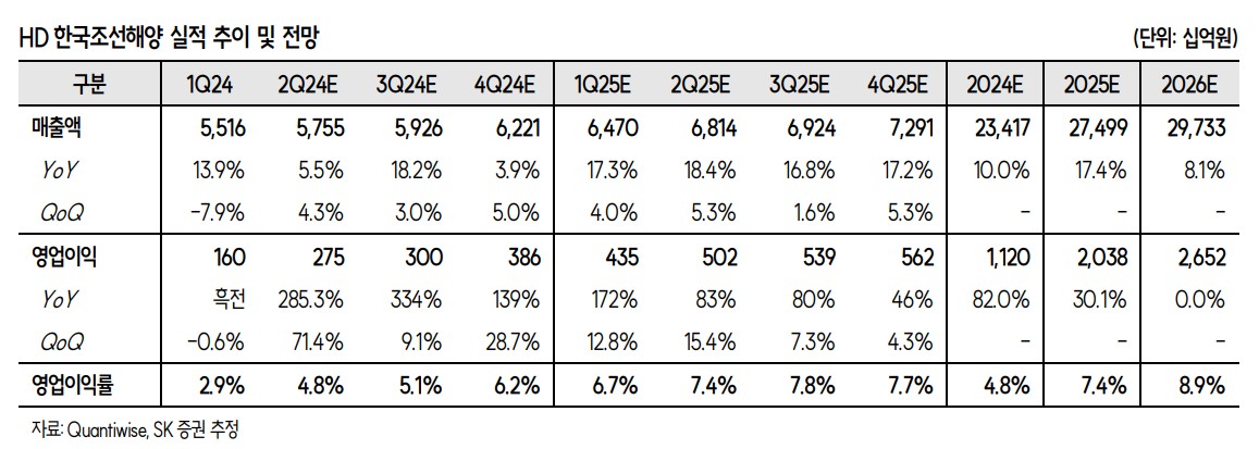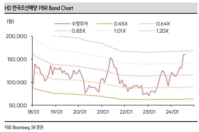 HD한국조선해양은 수주잔고를 안정적으로 확보하면서도 수익성을 유지하고 있음. 조선 자회사들의 실적 개선이 빠르게 진행되고 있어 긍정적인 전망이 예상됨. 특히, 선가 주도권을 바탕으로 한 계약 선가 상승이 실적에 큰 기여를 할 것으로 보임.