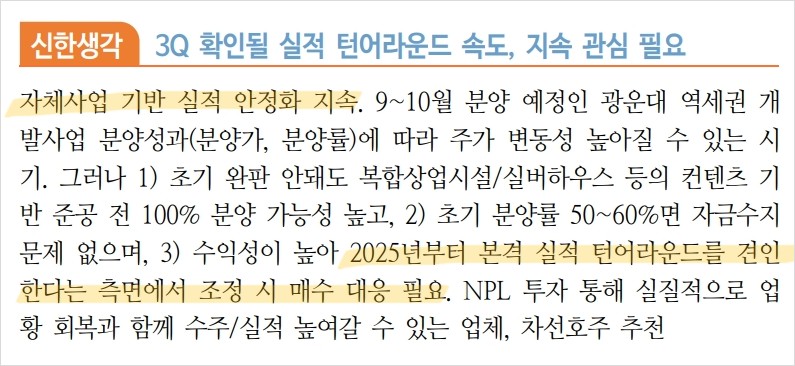 최근 HDC현대산업개발은 광운대 역세권 개발사업 분양을 앞두고 있음. 이는 주가에 긍정적인 영향을 미칠 것으로 예상됨. 인근 신규분양의 높은 청약수요와 주택가격 상승세를 고려할 때, 다소 높은 분양가에도 불구하고 분양 소화 가능성이 높음. 또한, 하반기 분양 예정 물량과 PF 구조조정 과정에서 현금흐름 개선이 기대됨.