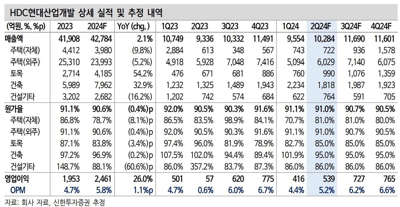 HDC현대산업개발 최근 영업실적 및 계약 상황을 살펴보면, 영업이익과 매출액이 꾸준히 증가하고 있음. 특히, 2024년 2분기 매출액은 1.0조원, 영업이익은 539억원으로 컨센서스 부합 예상됨. 주요 외주주택 현장 원가율 안정화로 인해 하반기에도 이익 개선세 지속될 전망.